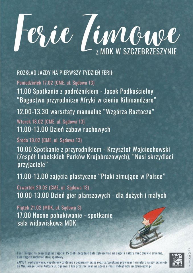 Zapraszamy dzieci i młodzież na spotkania i zajęcia w ramach Ferii Zimowych. Limit miejsc na poszczególne zajęcia jest ograniczony (decyduje data zgłoszenia).