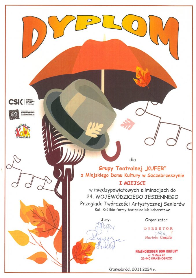 W dniu 20 listopada Grupa Teatralna KUFER działająca przy Miejskim Domu Kultury w Szczebrzeszynie (pod opieką Agnieszki Pańczyk) uczestniczyła w międzypowiatowych eliminacjach do 24. Wojewódzkiego Jesiennego Przeglądu Twórczości Artystycznej Seniorów, zdobywając pierwsze miejsce w kategorii krótkie formy teatralne i kabaretowe.